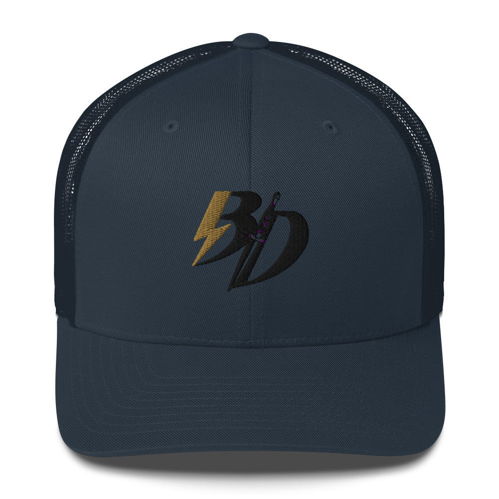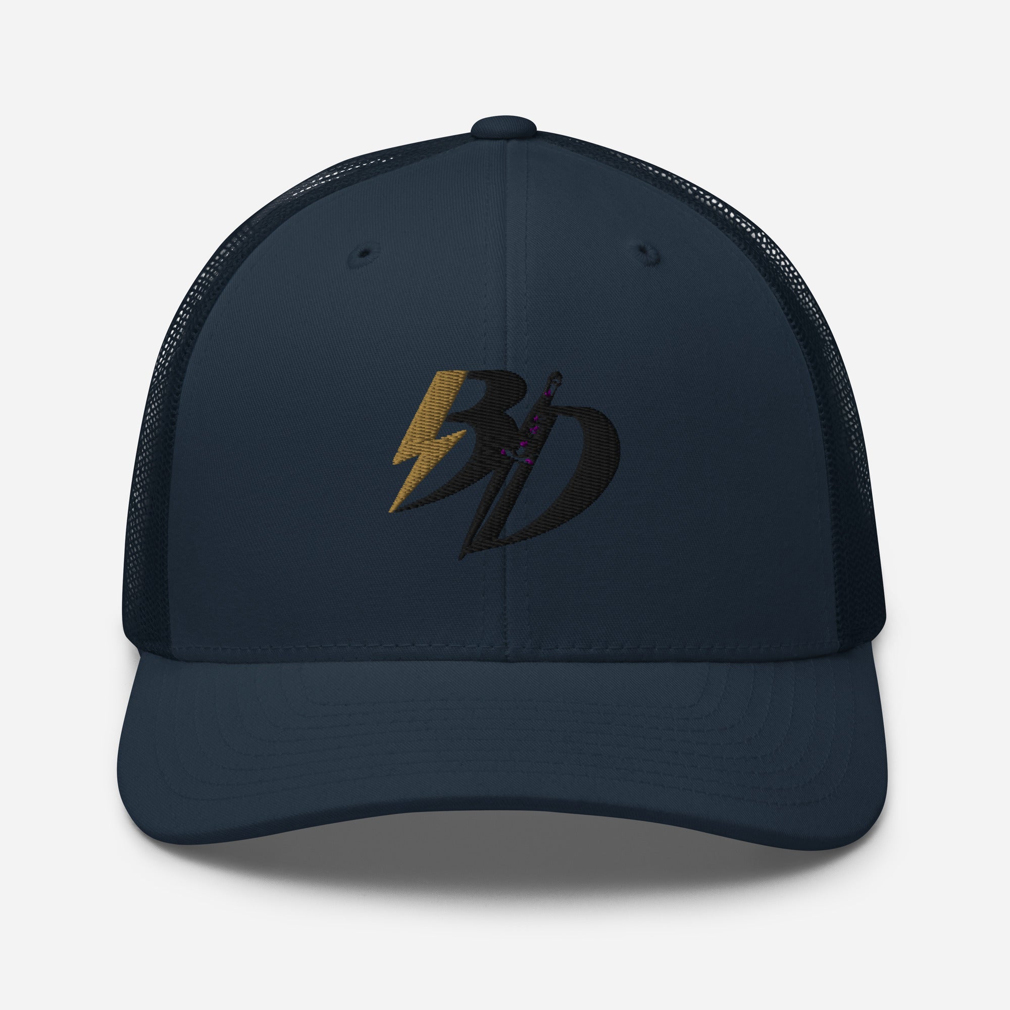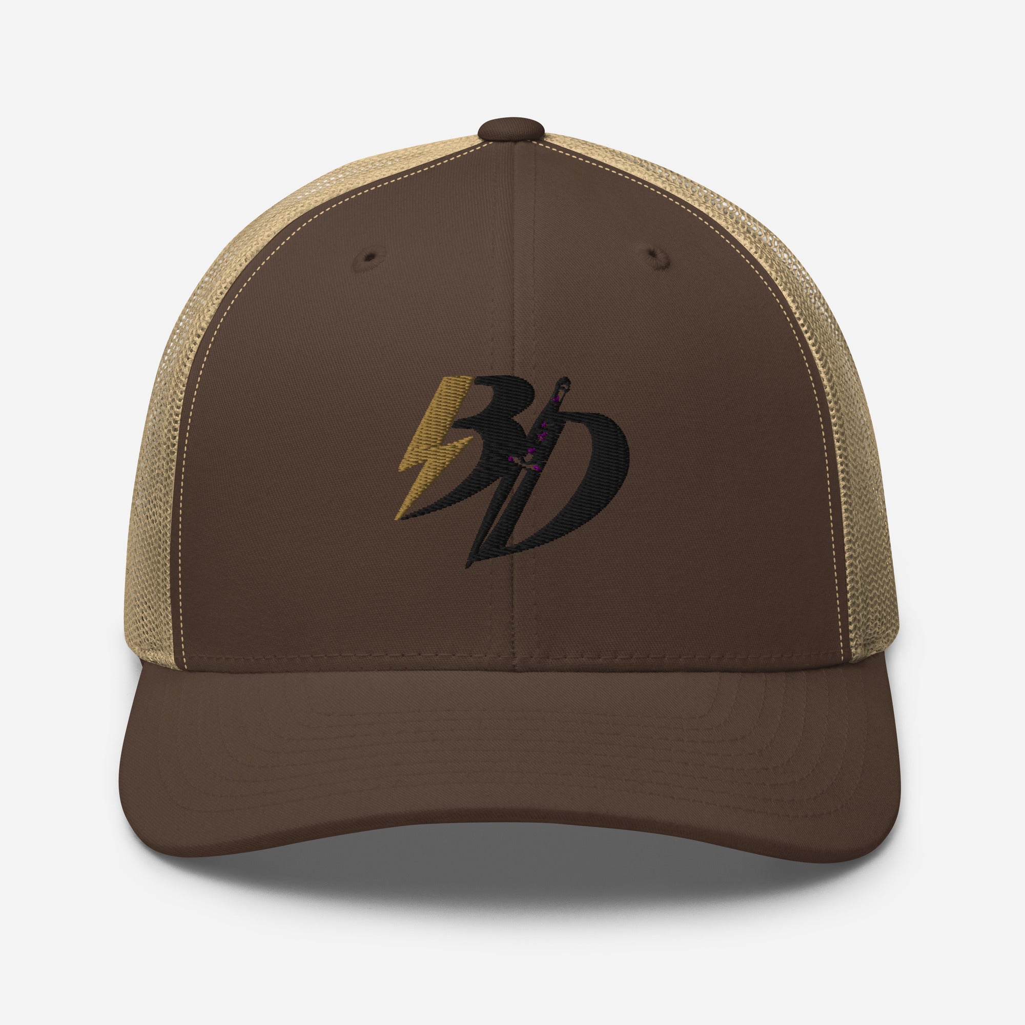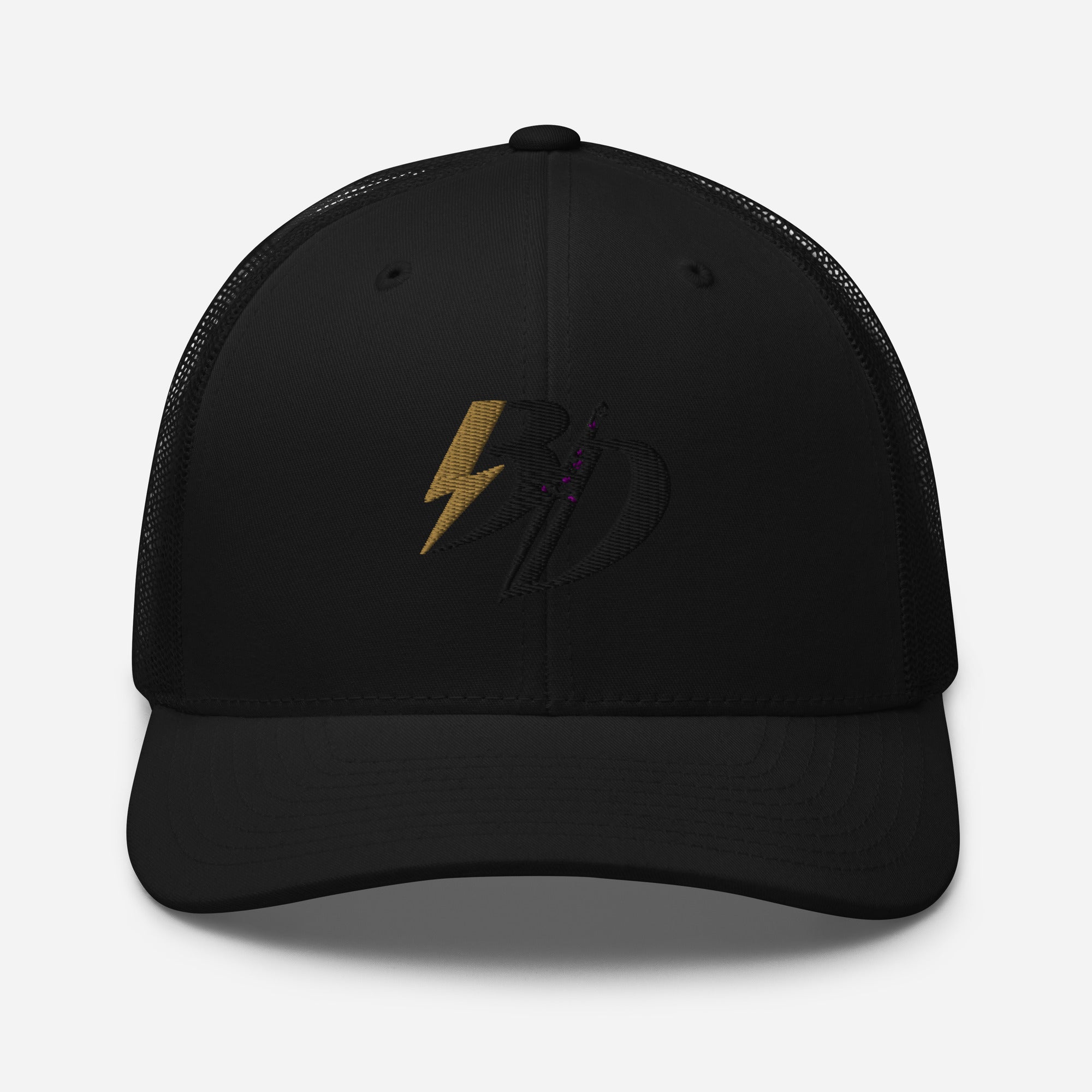 This six-panel trucker cap with a mesh back showcasing a little old gold.
