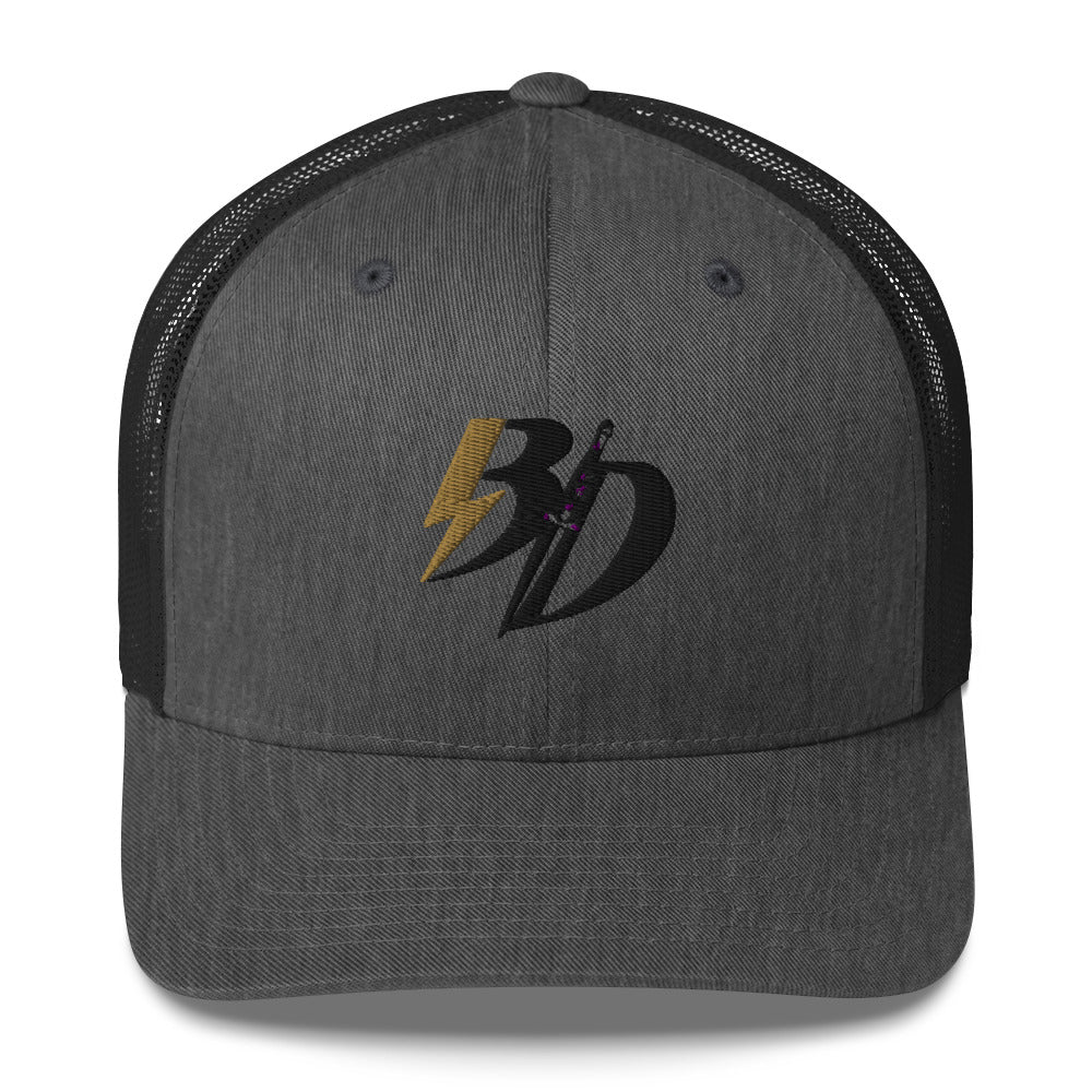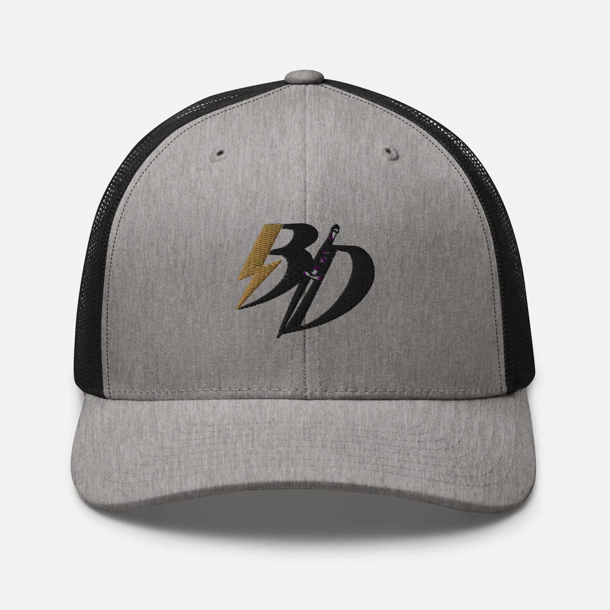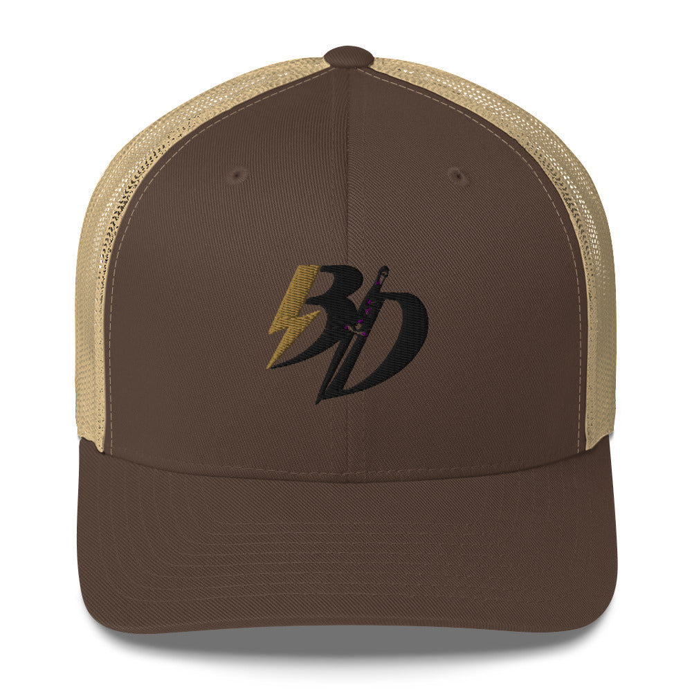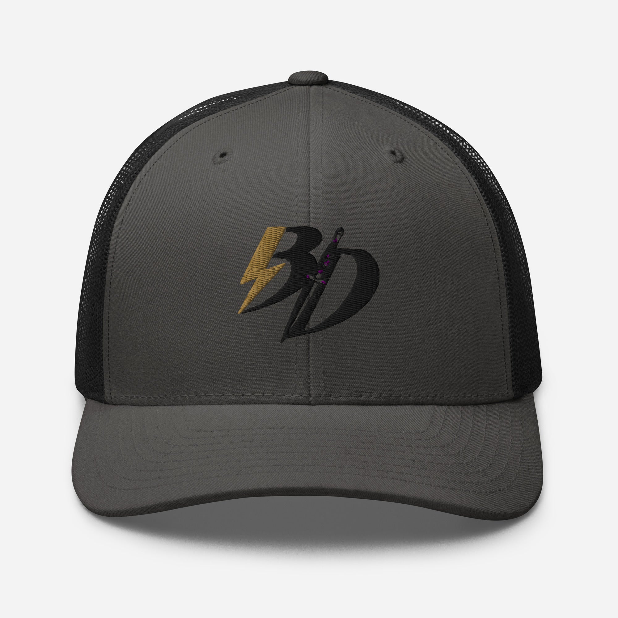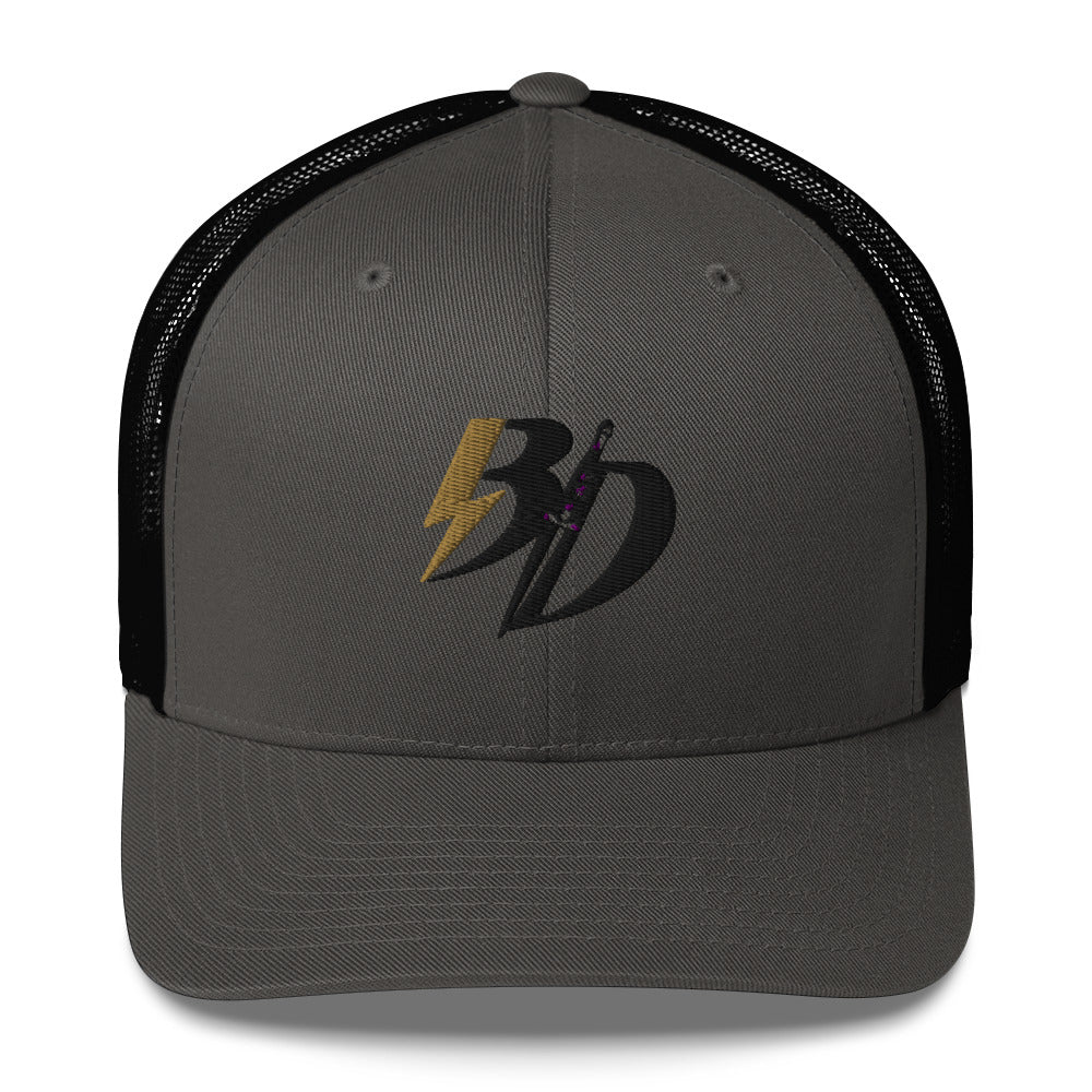 This six-panel trucker cap with a mesh back showcasing a little old gold.